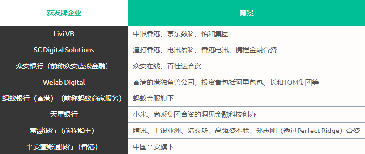截止2018年8月申请日之前,有近30家企业向香港金管局申请了虚拟银行牌照。最终,经过多轮角逐,在2019年3-5月时,香港金管局颁发了共8张虚拟银行牌照。